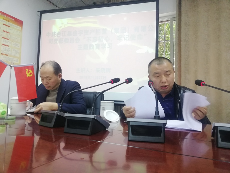 2019年11月27日合江縣金宇資產(chǎn)經(jīng)營(集團)有限公司組織“不忘初心、牢記使命”主題教育學(xué)習(xí),朱曉輝總經(jīng)理在會上要求員工時刻牢記“講政治、講忠誠”“守紀(jì)律、講規(guī)矩”,樹牢紅線意識;指出主題教育學(xué)習(xí)在時間安排上雖然接近尾聲,但是時刻不能松懈,要持續(xù)增強“四個意識”、堅定“四個自信”、做到“兩個維護”,為新時代發(fā)展站好崗、履好職。