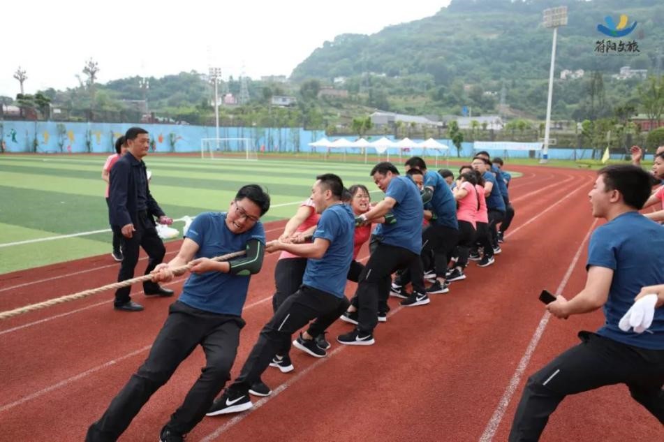 隨著哨聲一響,我們雙手握緊長繩,咬緊牙關向后拉,為了把握節(jié)奏形成合力,心里默念著“一二、一二”,場上一時僵持難下,但難敵強悍對手,第一局廣源達勝。這仿佛符合多數(shù)人的預期,但我們怎會被拘于這固定印象,越戰(zhàn)越勇才是符陽文旅人的風姿。第二場對決比第一場更加艱難,一開場廣源達占據(jù)絕對優(yōu)勢,我們險被拉到了終線,全憑一口氣死撐,牙關咬緊,身體后傾,不斷降低重心,腳步穩(wěn)扎,做著別人眼里無畏的掙扎。一定不能越線!在超高壓下堅持了十余秒,那一刻拼的就是韌勁!一群瘦弱的文旅人憑著一股拼勁慢慢把賽場主動權(quán)掌握在了自己手中,每向后移動一步,心里的勁更足了,如荒漠迷路的旅者遇見了綠洲,我們也尋得了力量之源。當現(xiàn)場歡呼聲響起時,我們已癱坐一片,不敢置信,我們贏啦!