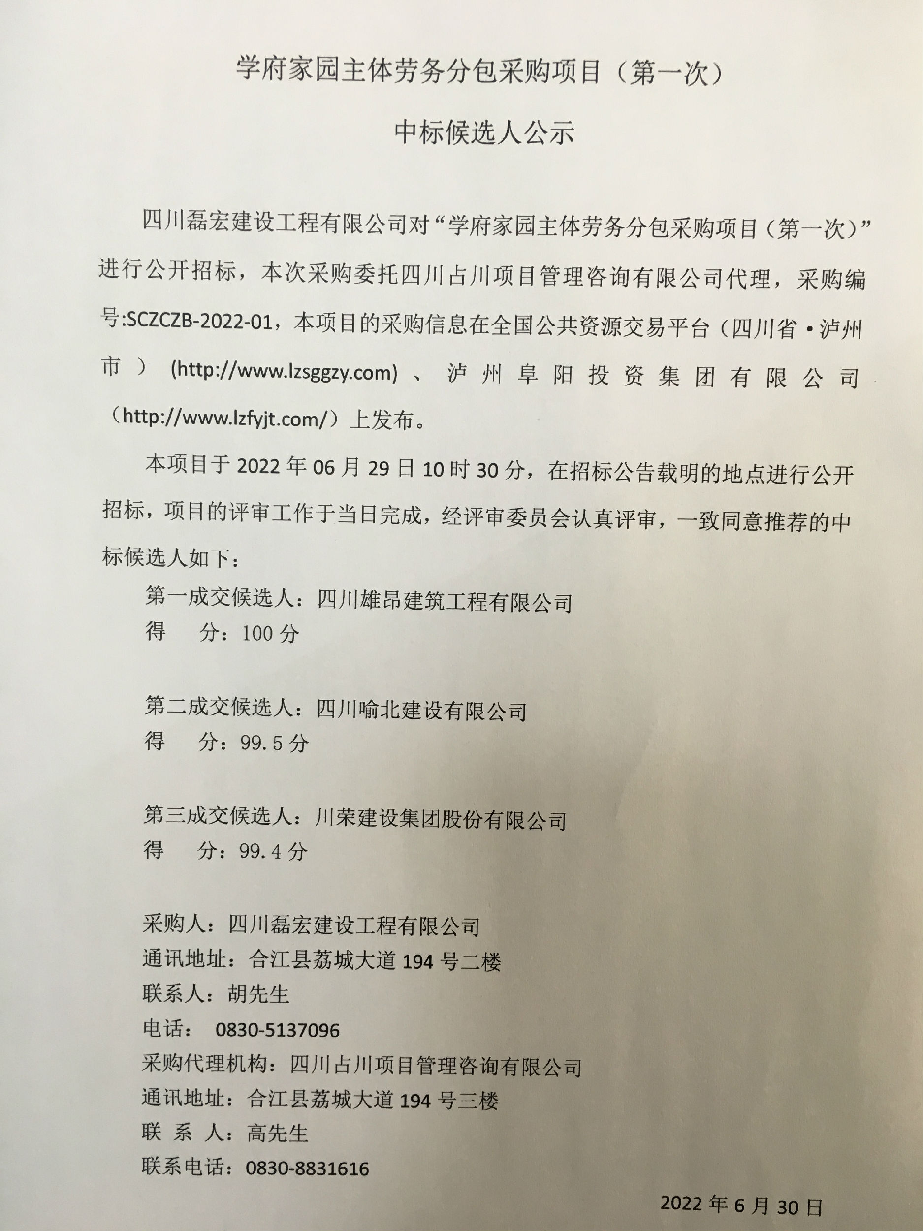 學府家園主體勞務(wù)分包采購項目(第一次)中標候選人公示