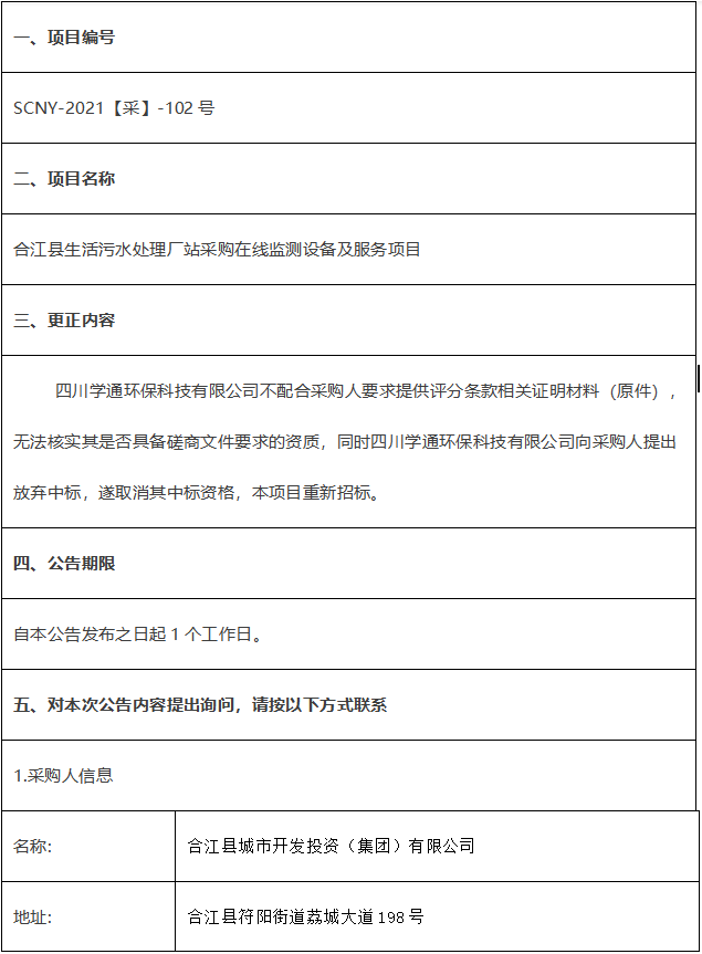 合江縣生活污水處理廠(chǎng)站采購(gòu)在線(xiàn)監(jiān)測(cè)設(shè)備及服務(wù)項(xiàng)目競(jìng)爭(zhēng)性磋商結(jié)果更正公告