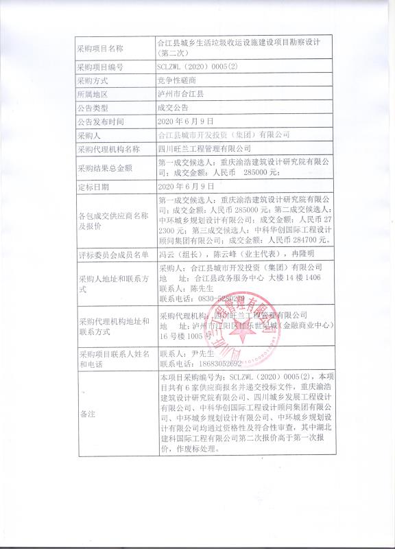 合江縣城鄉(xiāng)生活垃圾收運設(shè)施建設(shè)項目勘察設(shè)計招標(第二次)成交公告