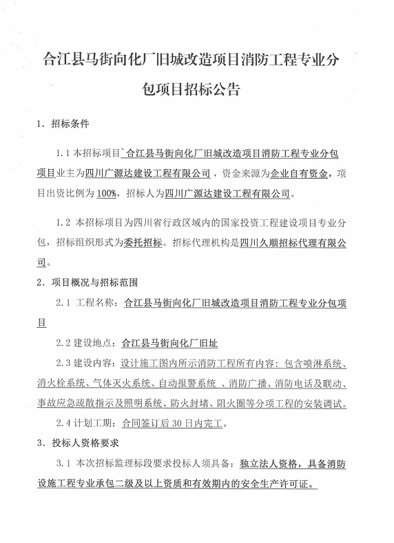 合江縣馬街向化廠舊城改造項(xiàng)目消防工程專業(yè)分包項(xiàng)目招標(biāo)公告