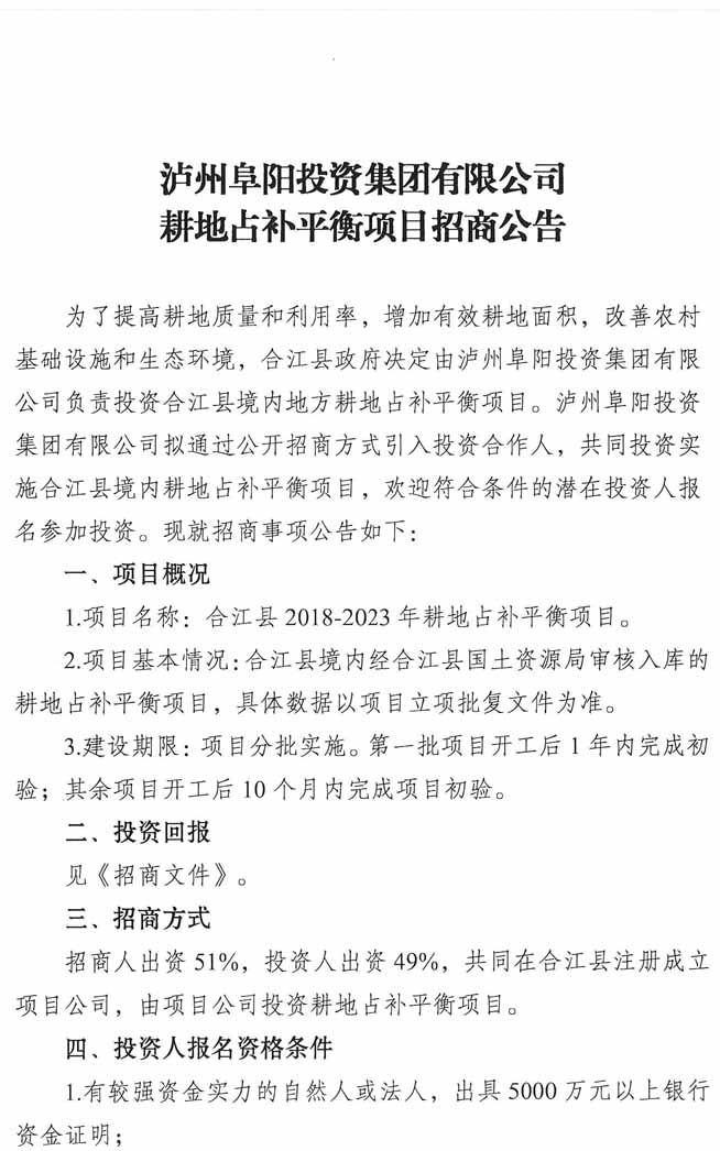 招商公告:瀘州阜陽(yáng)投資集團(tuán)有限公司耕地占補(bǔ)平衡項(xiàng)目招商公告