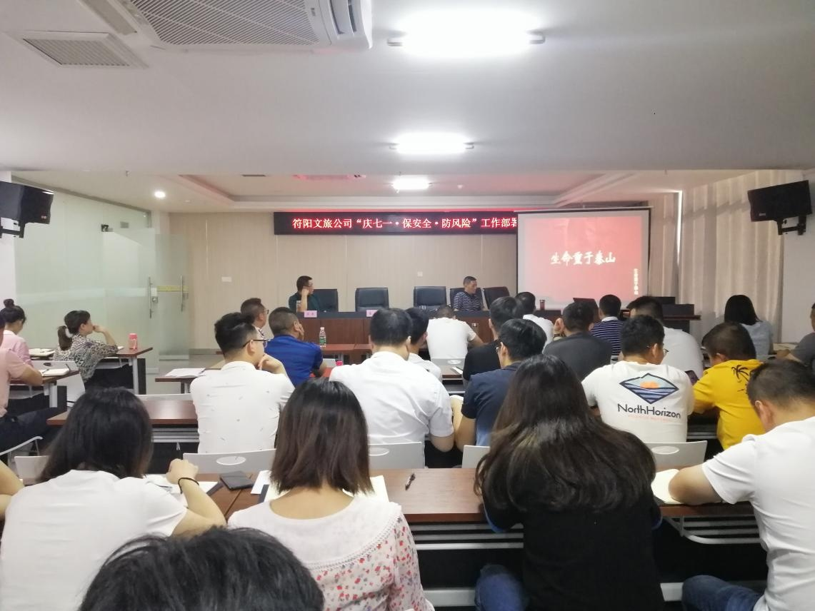 2021年6月23日,符陽文旅公司召開“ 慶七一·保安全·防風(fēng)險”工作部署會,阜陽集團副總胡天華參加會議,公司總經(jīng)理吳平主持會議,公司全體員工及龍掛山項目 參建單位項目負(fù)責(zé)人、安全管理人員參加 。