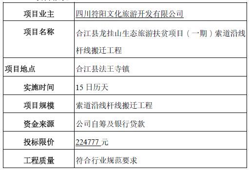 請通過資格審查的參加競爭性談判人員帶好有效身份證、公司介紹信、授權(quán)委托書、資質(zhì)證明等資料的原件與復(fù)印件(上述復(fù)印件須蓋單位鮮章,原件查驗后當(dāng)場退還。于北京時間2019年9月18日9:00,在四川省瀘州市合江縣荔城大道190號四川符陽文化旅游開發(fā)有限公司二樓會議室公開舉行合江縣龍掛山生態(tài)旅游扶貧項目(一期)索道沿線桿線搬遷工程競爭性談判活動,四川符陽文化旅游開發(fā)有限公司根據(jù)承諾報價最低價原則確定中選人。