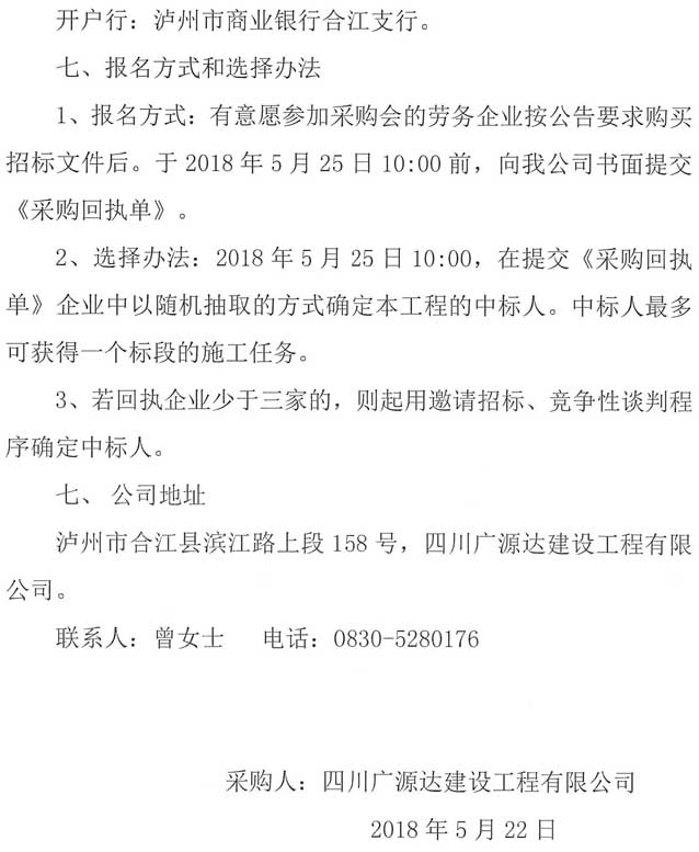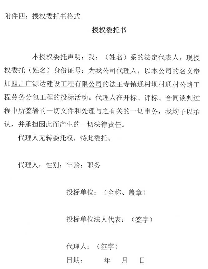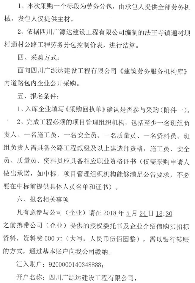 四川廣源達建設工程有限公司法王寺鎮(zhèn)通樹壩村通村公路工程勞務分包企業(yè)采購公告.doc