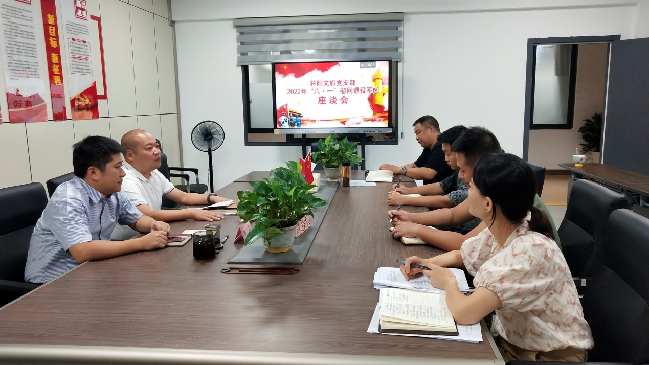 為扎實做好擁軍優(yōu)屬 、 擁政愛民工作 , 在 “ 八 一 ” 建軍節(jié)來臨之際, 符陽文旅黨支部開展 “ 八一 ” 慰問活動, 組織文旅 公司工作的退役軍人召開座談會, 了解他們的工作和生活情 況, 為他們送上慰問金, 并致以節(jié)日的祝福。 退役軍人表示 感受到公司的關(guān)懷和愛心,在今后的工作中發(fā)揮軍人本色, 為公司發(fā)展貢獻力量。