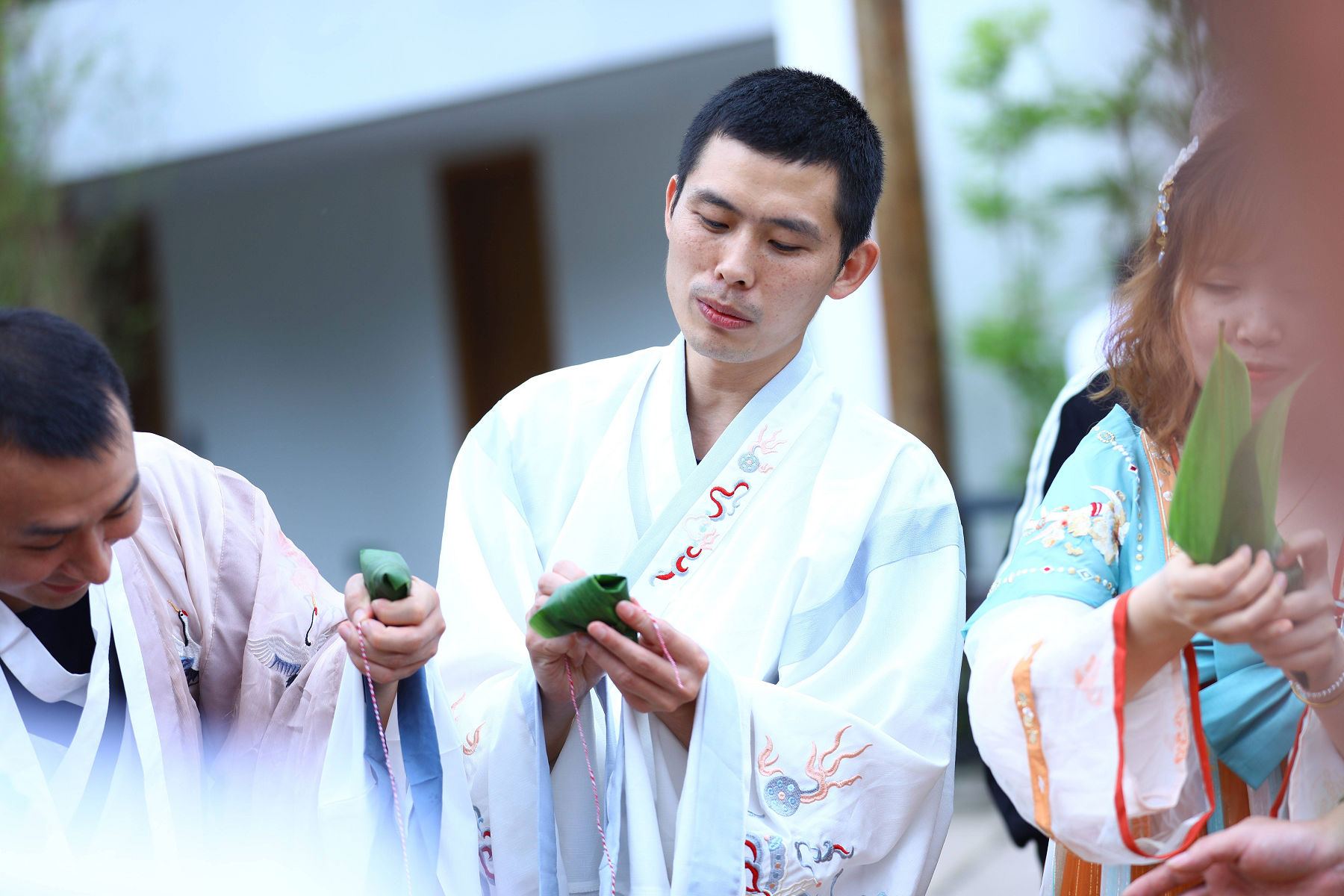 龍掛山景區(qū)是阜陽集團下屬符陽文旅公司打造的的文 化休閑度假旅游目的地, 景區(qū)云霧如海, 美景如畫, 建筑獨 具傳統(tǒng)川南民宿特色。 活動中, 阜陽集團員工身著漢服, 人 與自然情景交融、交相輝映,仿若穿越到了“狗吠深巷中、 雞鳴桑樹顛”的古代美好田園生活。在見禧 . 山語的院子里, 大家圍成一圈, 開展包粽子比賽。 員工們踴躍參加、 興致高 漲, 集團總經(jīng)理任東財和員工們一起動手, 互相學習、 邊學 邊包、 比拼手藝, 包出了三角形、 長方形、 圓錐形等形態(tài)各 異的粽子,現(xiàn)場洋溢著歡樂的節(jié)日氣氛。